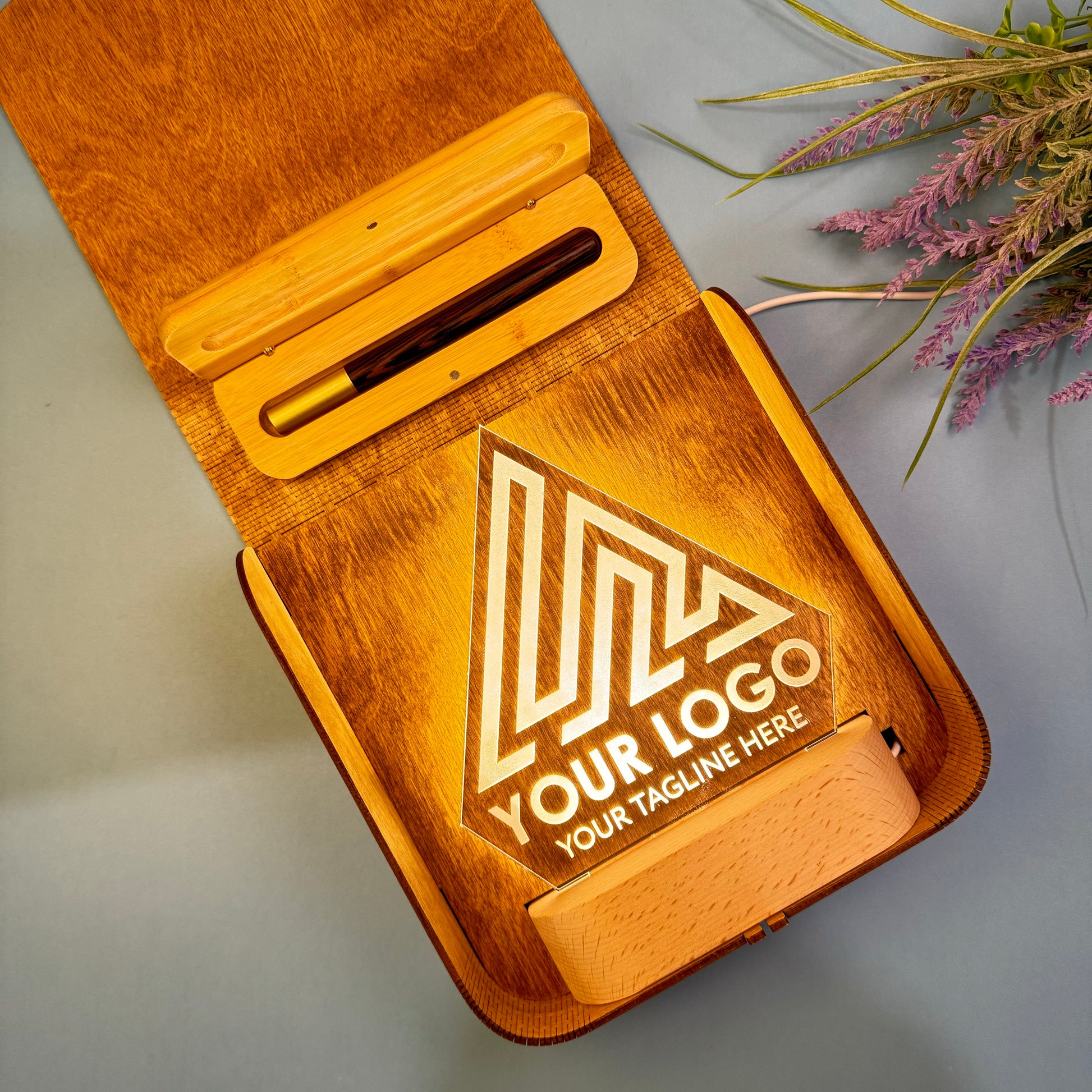Personalized Elegance: Premium Wooden Gift Set with LED Logo Display